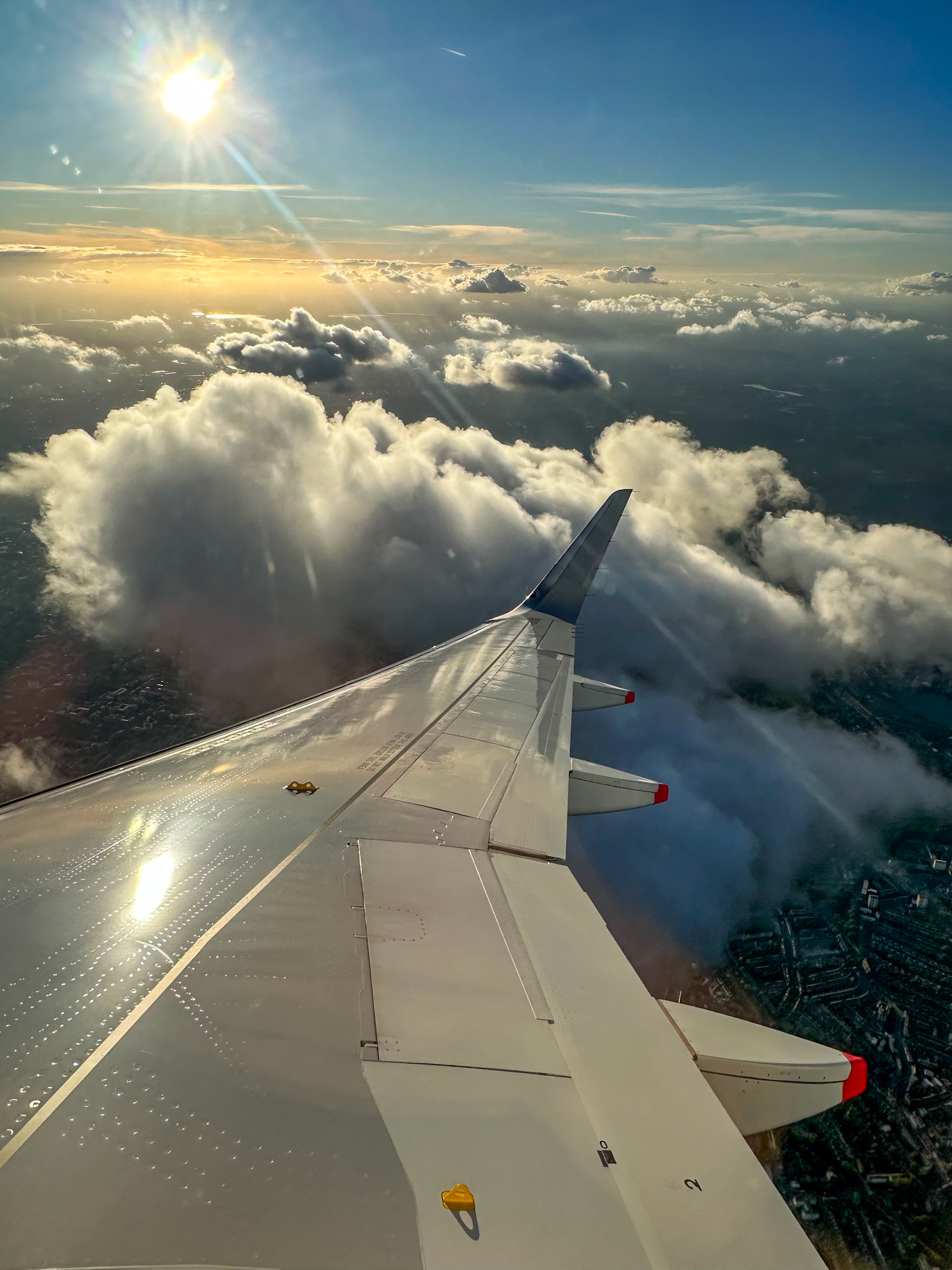 Hillingdon, London, UK - Dec 25, 2022: Airplane wing and puffy clouds over London suburbs