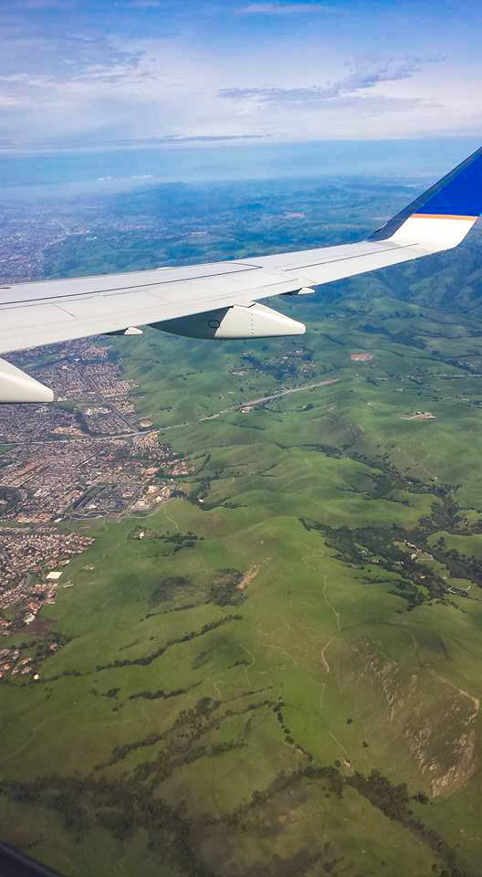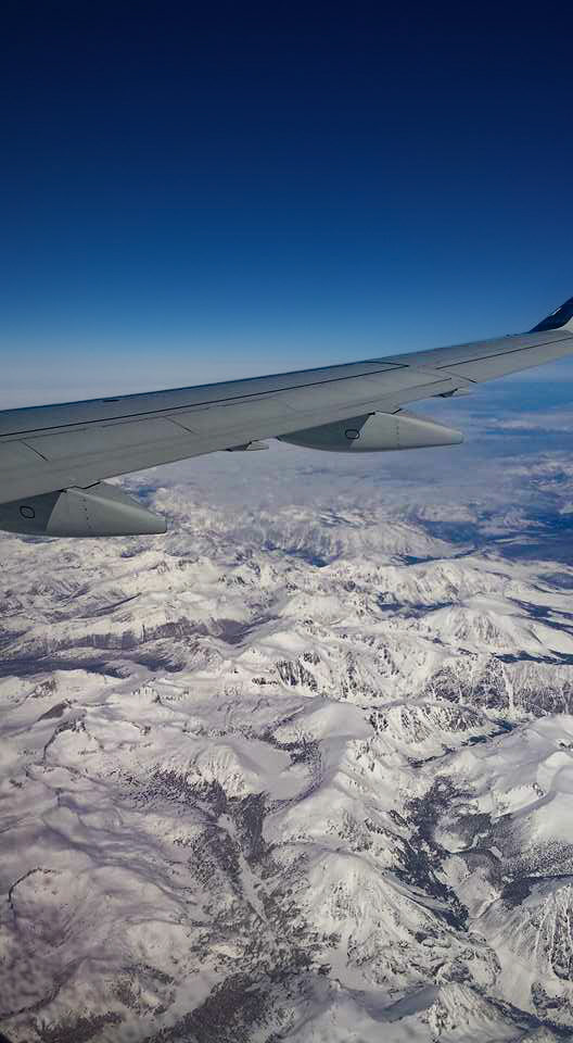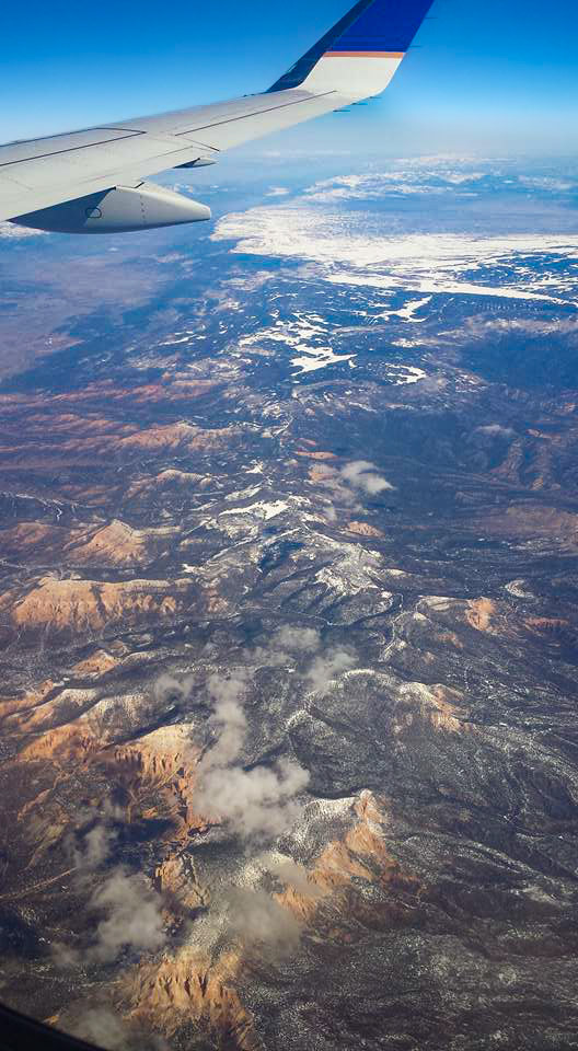 Colorado, US - Nov 1, 2017: Fields and snow-capped mountains beneath airplane wing